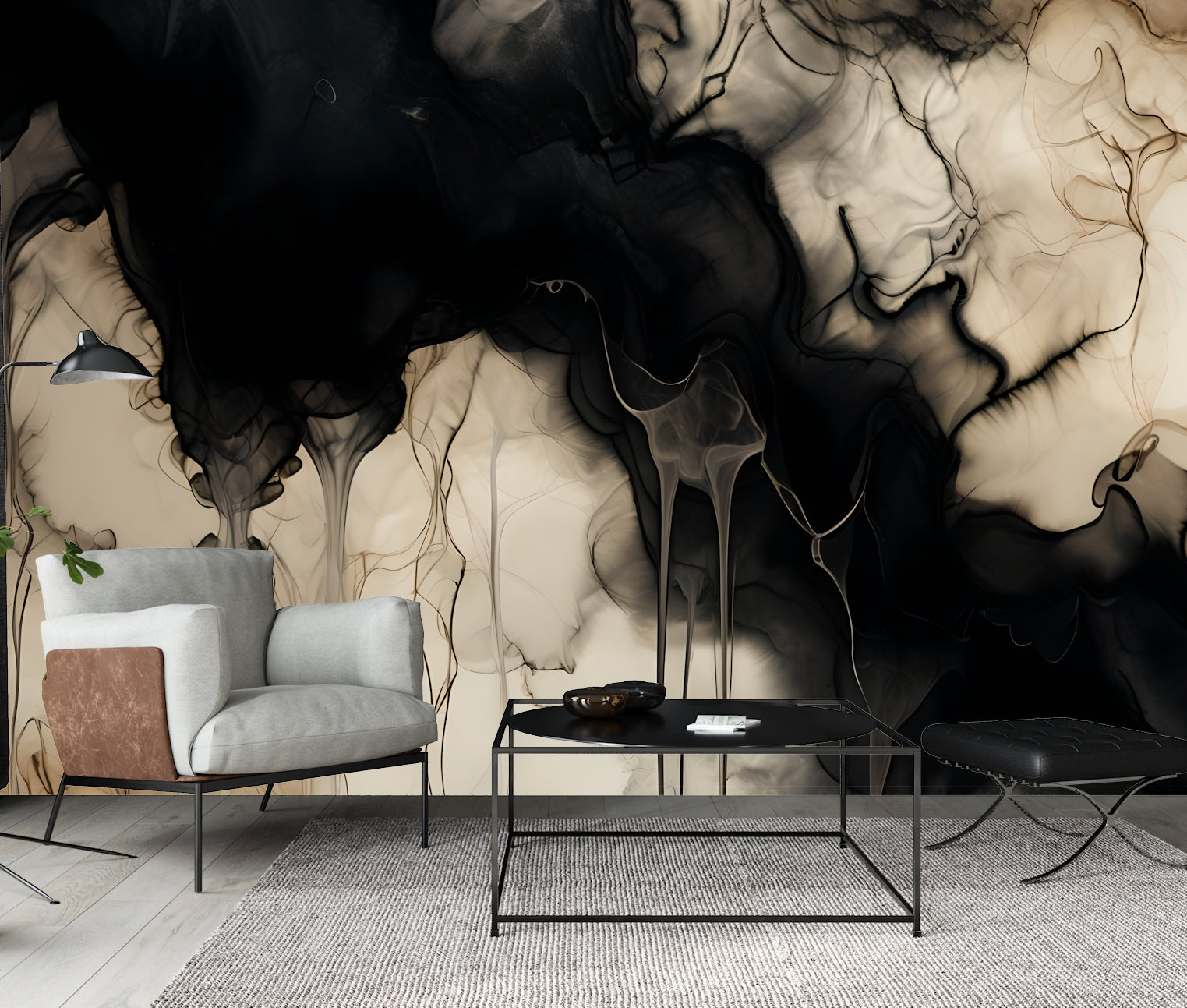 Elevate your space with this stunning Black Abstract Wallpaper Mural, featuring soft greys, warm taupes, and intriguing movement. The fluid design evokes an atmospheric landscape, blending contemporary art with natural tones to create a high-end, gallery-inspired backdrop for your living room, bedroom, or office. Luxury wallpaper.