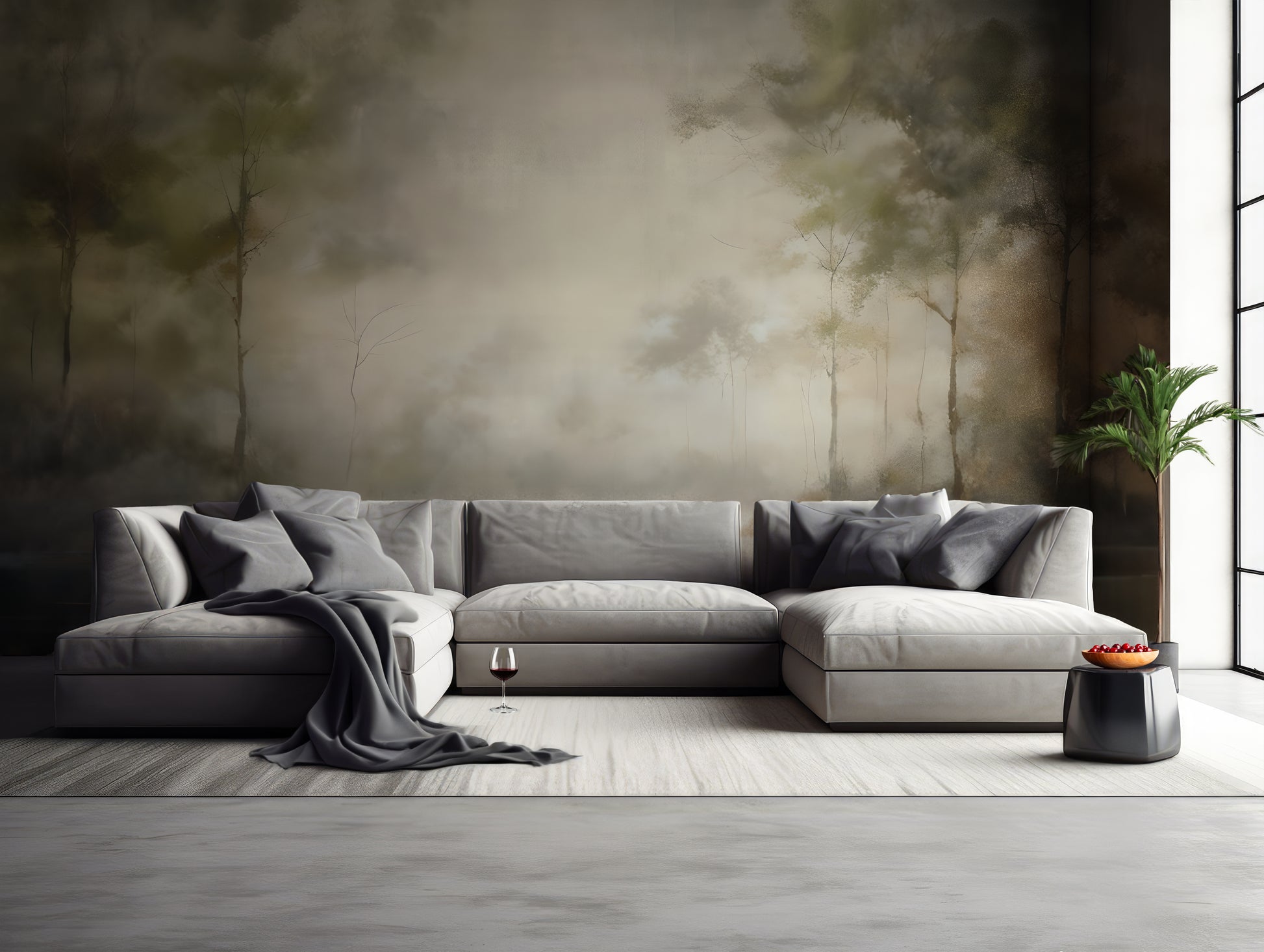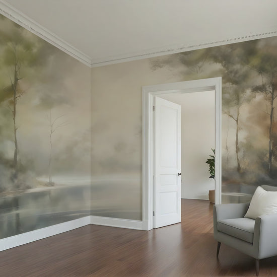 Elevate your space with this stunning Forest with Calm Waters Abstract Wallpaper Mural, featuring soft shades of greens and rust, beiges, blues, and creamy off whites. The painted design and subtle color washes blend contemporary art with natural tones to create a high-end, gallery-inspired backdrop for your living room, bedroom, or office. Luxury wallpaper. Also works great for all walls in high end powder bath...