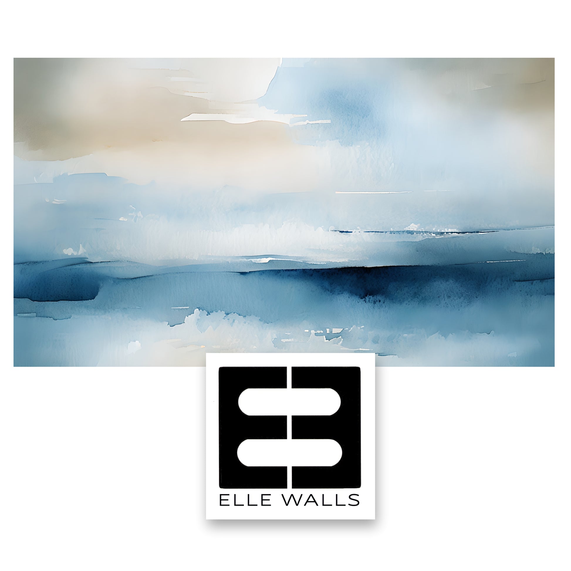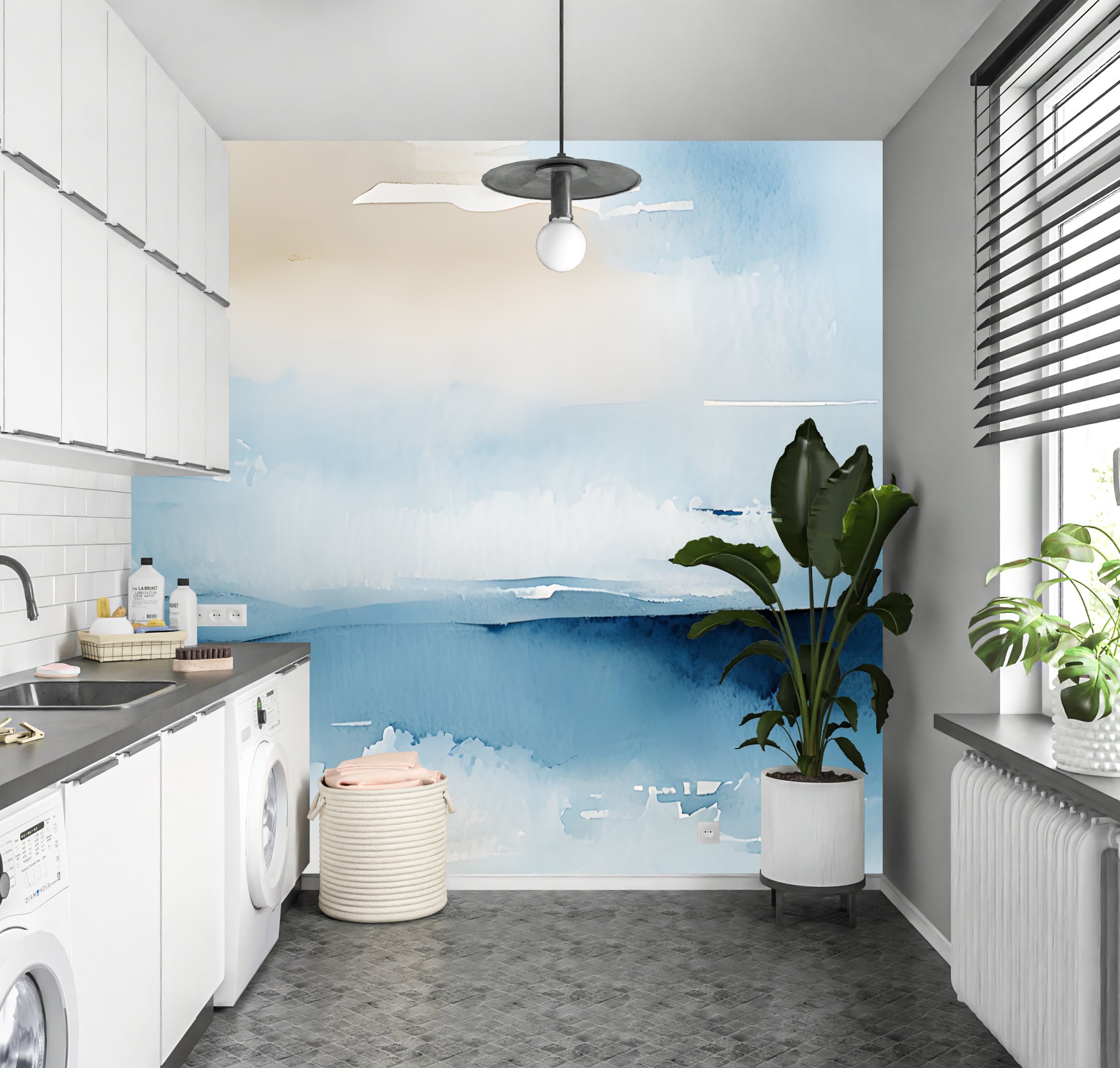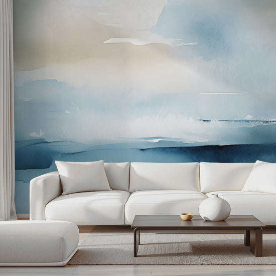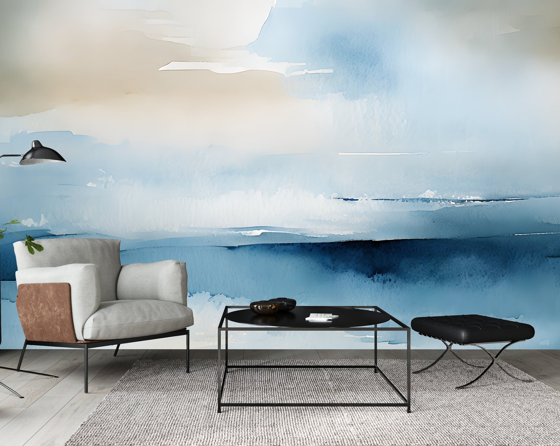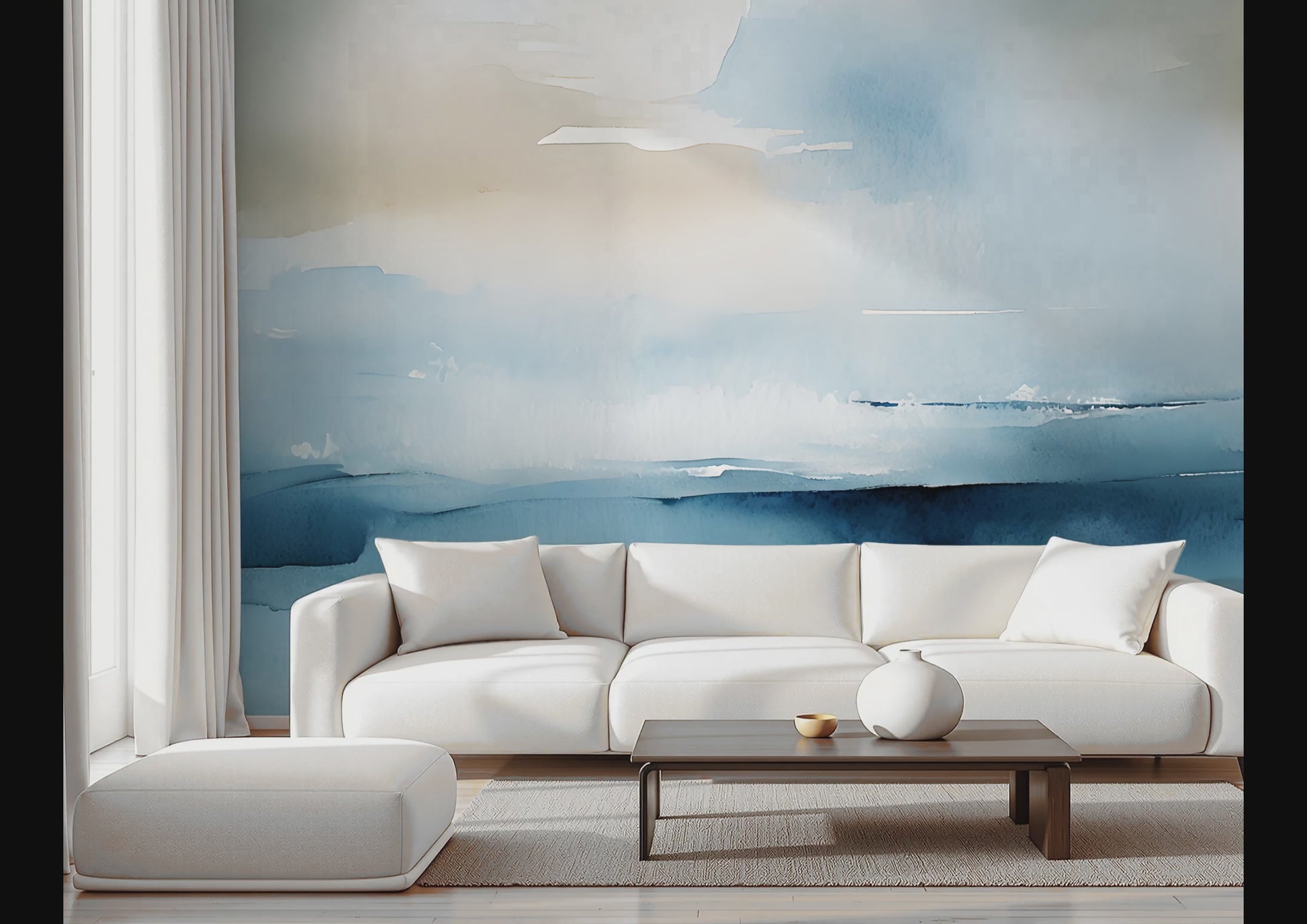 Elevate your space with this stunning Coastal Watercolor Abstract Wallpaper Mural, featuring soft blues, beiges, and creamy whites. The striking design evokes a minimalist feeling blending contemporary art with natural coastal tones to create a high-end, gallery-inspired backdrop for your living room, bedroom, or office. Luxury wallpaper.