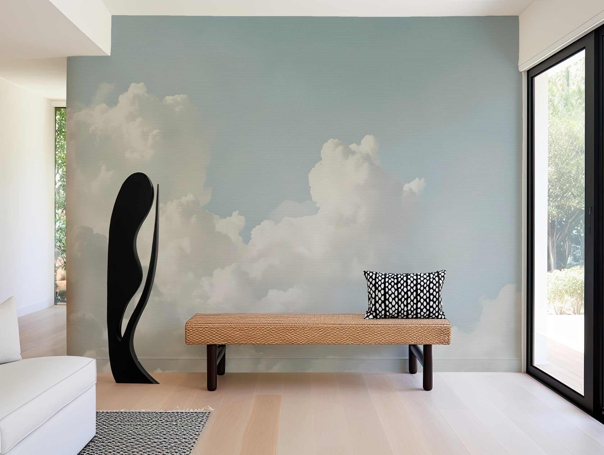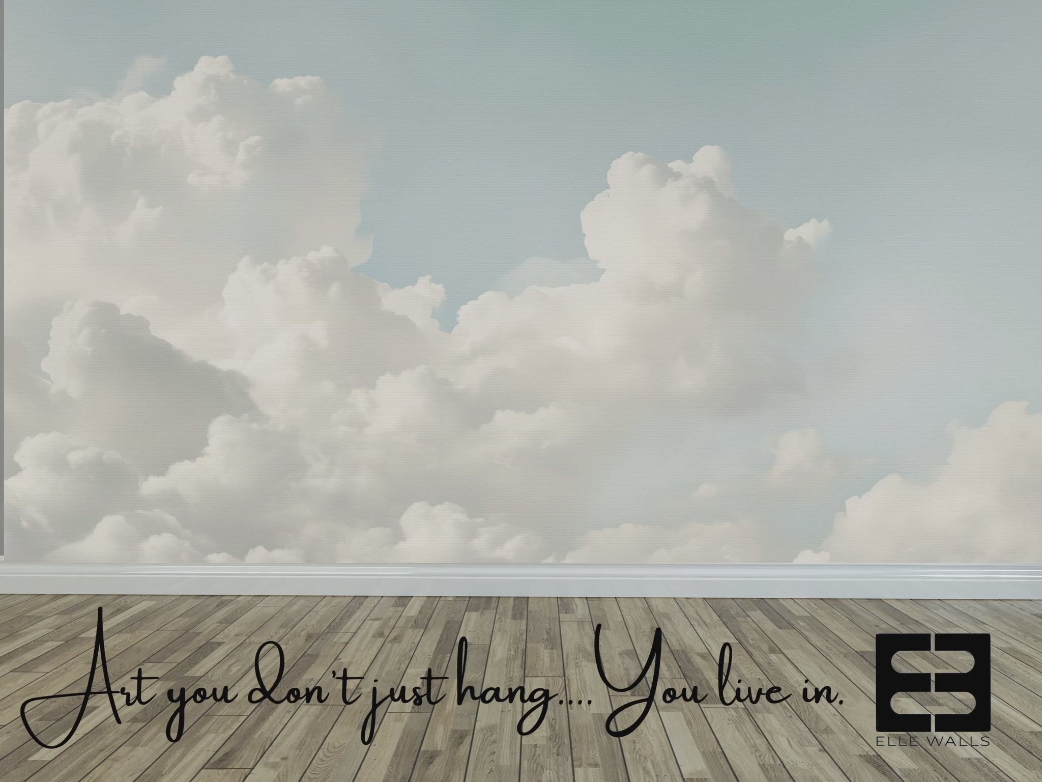 PUFFY CLOUDS WATERCOLOR PAPER LOOK LUXURY WALLPAPER MURAL - Elevate your space with this stunning soft painterly Wallpaper Mural, featuring soft blues and creamy whites. The soothing colors and feel of the soft billowing clouds help to create a high-end, gallery-inspired backdrop for your living room, bedroom, or office. Luxury wallpaper. Also works great for all wall in high end powder bath! You can see the details of the watercolor paper from the original painting that this was mural was created from. Stunning.