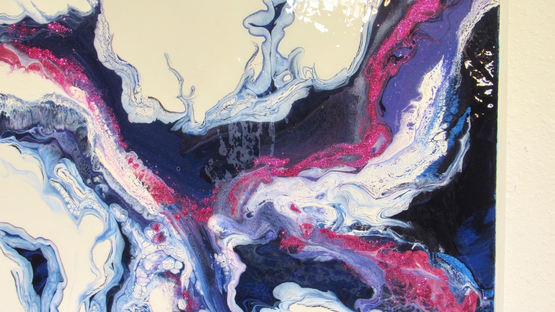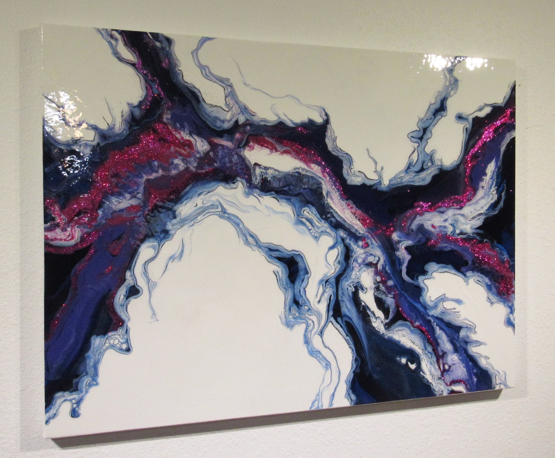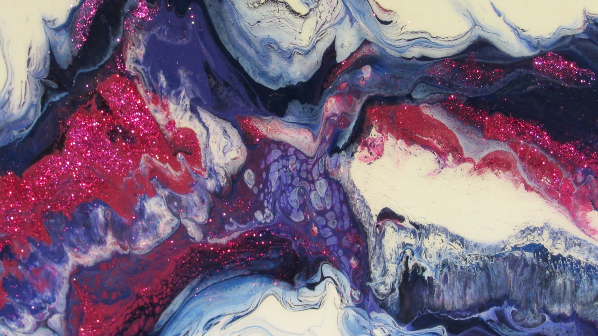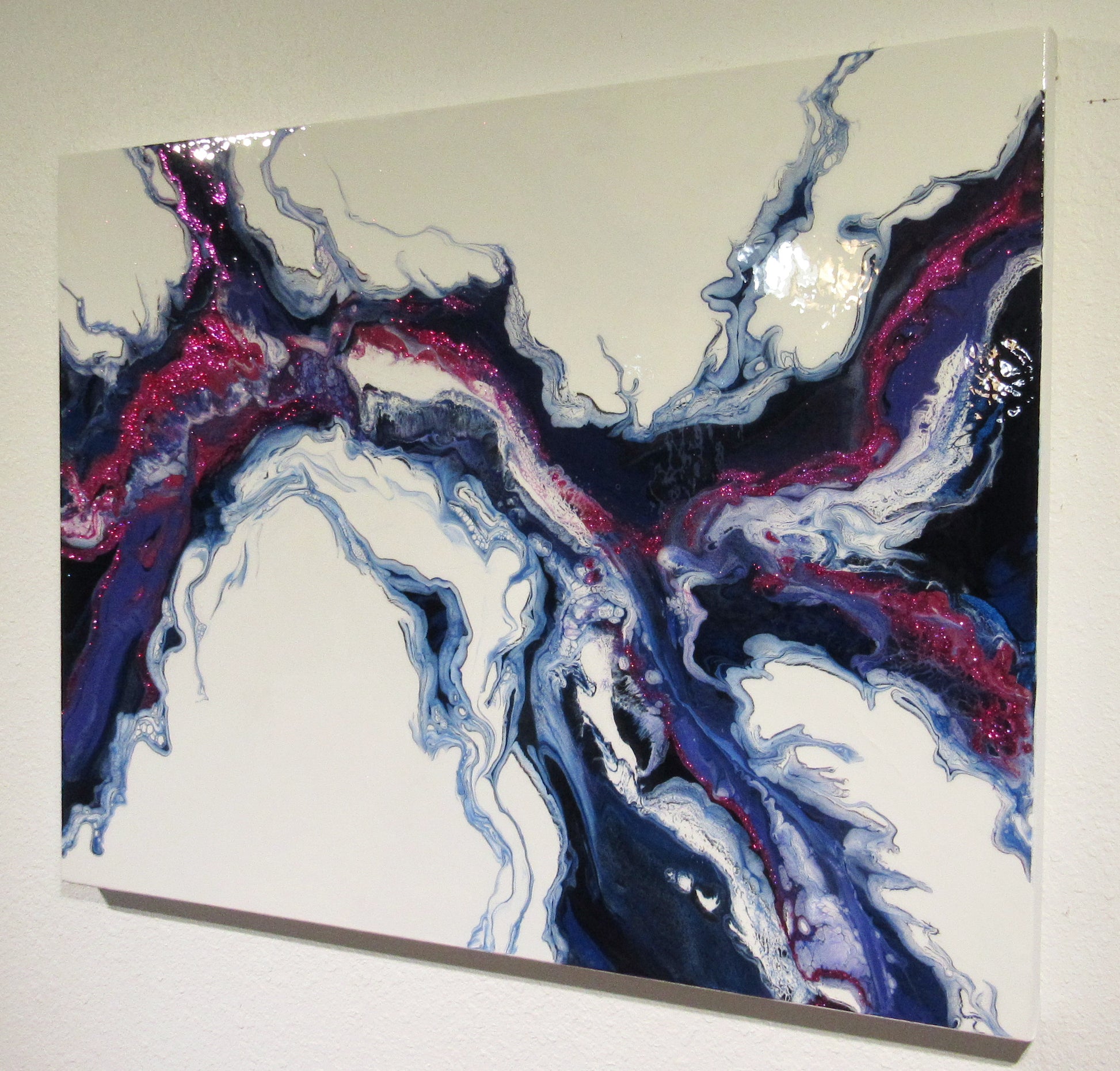 Shades of Blues, purples, magentas, micro metal flake magenta, silvers and creamy whites.