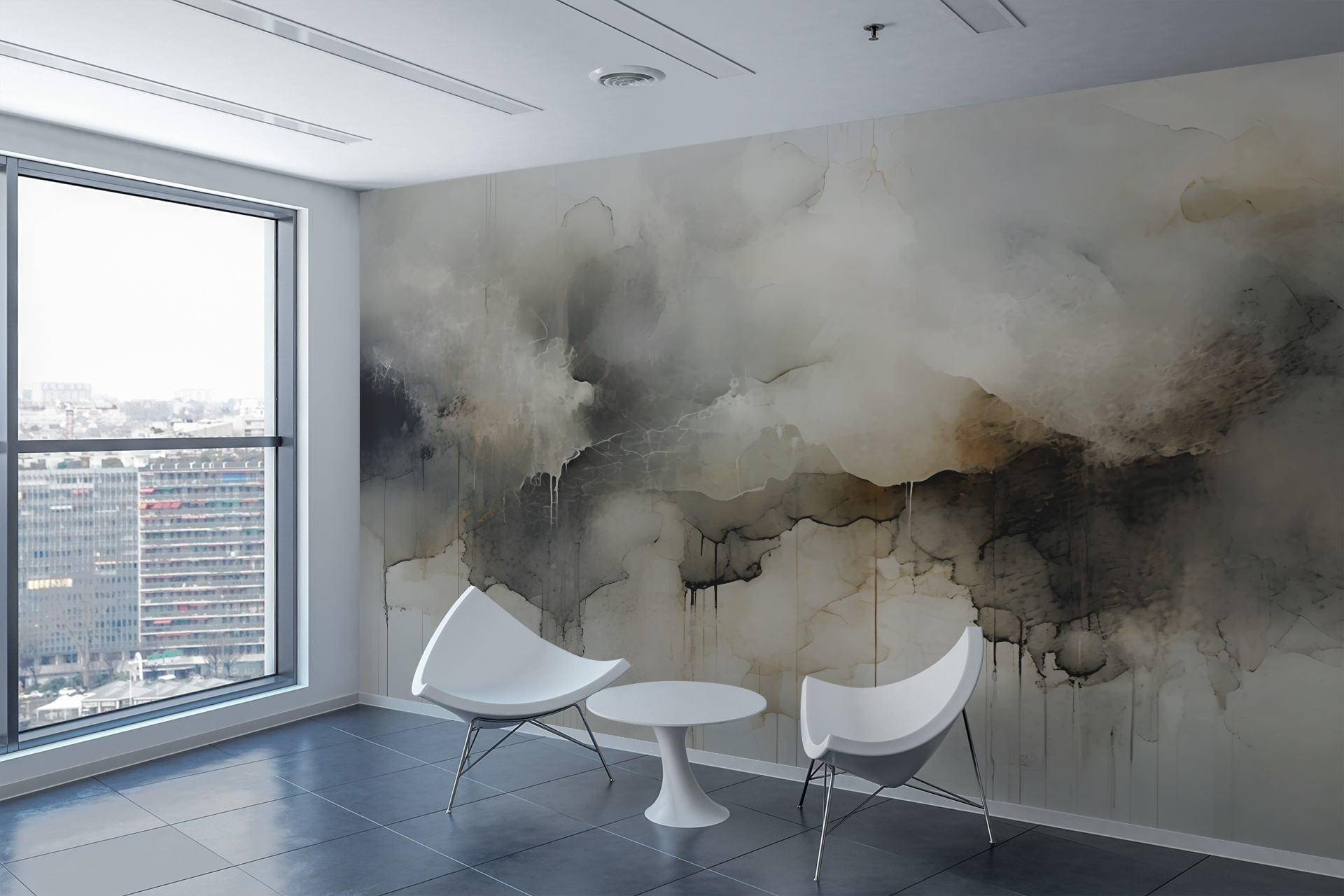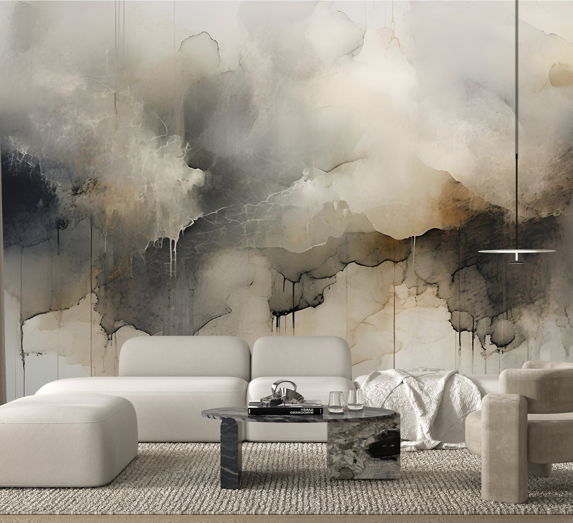 Elevate your space with this stunning Neutral Abstract Wallpaper Mural, featuring soft greys, warm taupes, and dynamic ink-like drips. The fluid design evokes an atmospheric landscape, blending contemporary art with natural tones to create a high-end, gallery-inspired backdrop for your living room, bedroom, or office. Luxury wallpaper.
