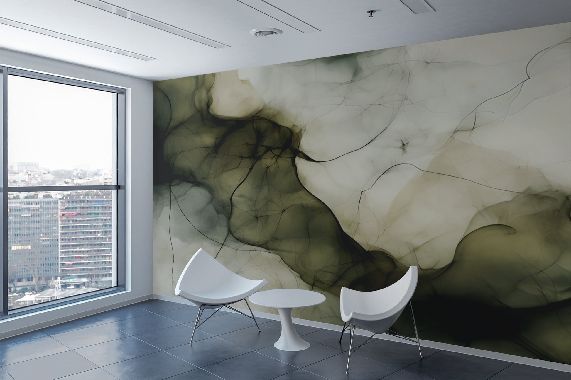 Elevate your space with this stunning Olive Green Abstract Wallpaper Mural, featuring soft greys, Olive Green, black, and intriguing movement. The fluid design evokes an atmospheric landscape, blending contemporary art with natural tones to create a high-end, gallery-inspired backdrop for your living room, bedroom, or office. Luxury wallpaper.