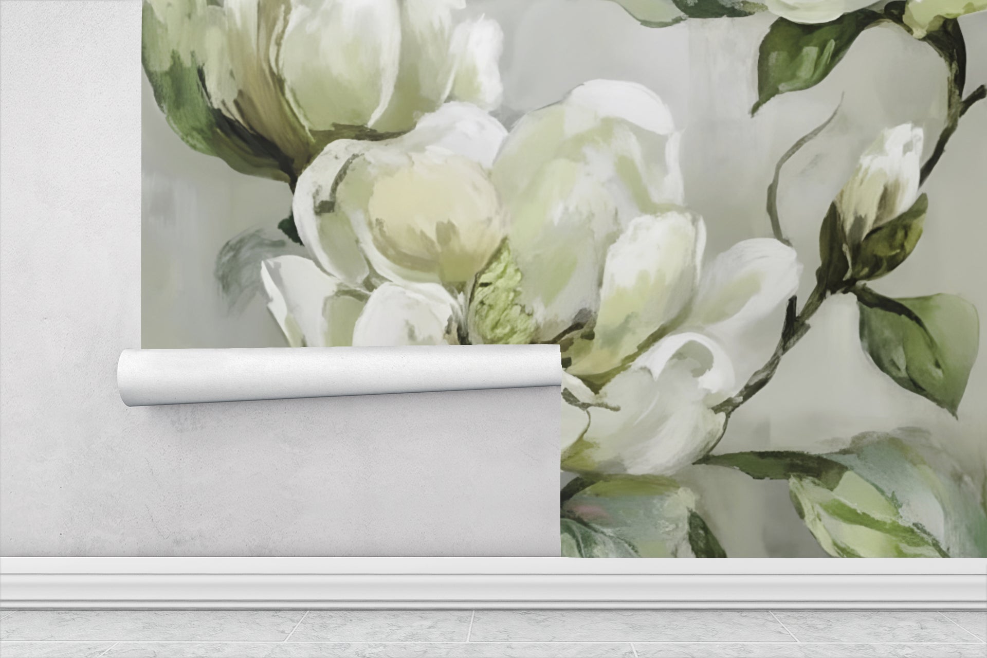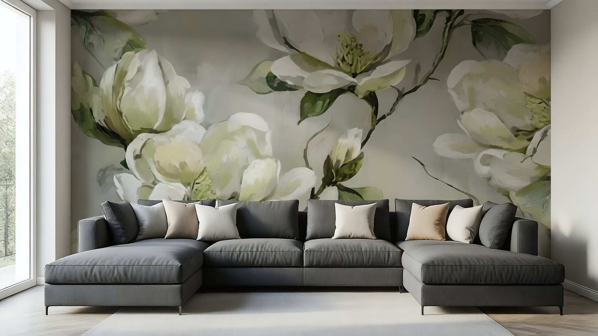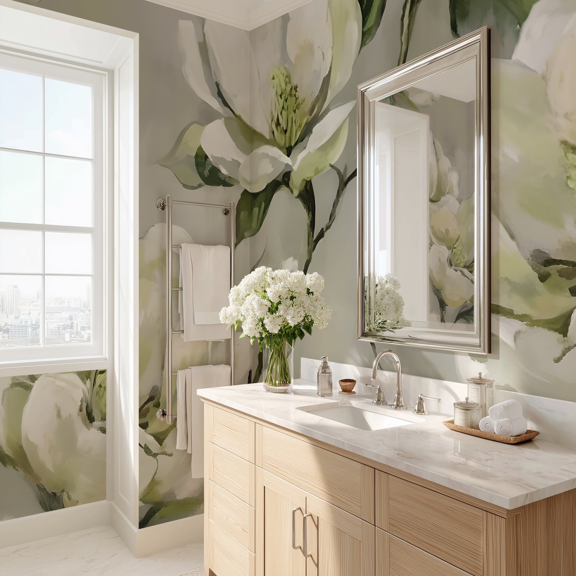 Elevate your space with this stunning Floral Abstract Wallpaper Mural, featuring soft greys, warm greens and creamy whites. The painted design and subtle color washes blend contemporary art with natural tones to create a high-end, gallery-inspired backdrop for your living room, bedroom, or office. Luxury wallpaper. Also works great for all walls in high end powder bath...