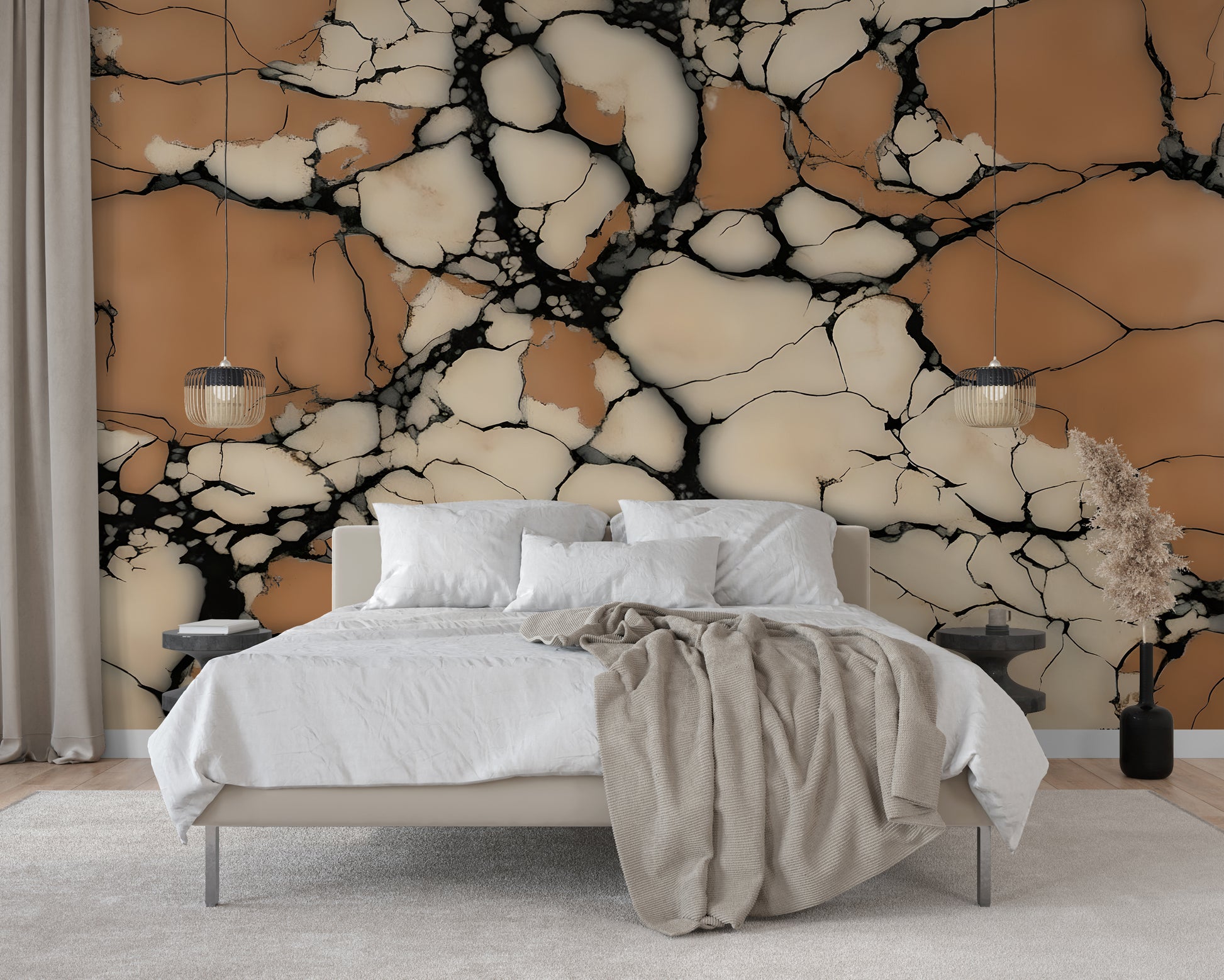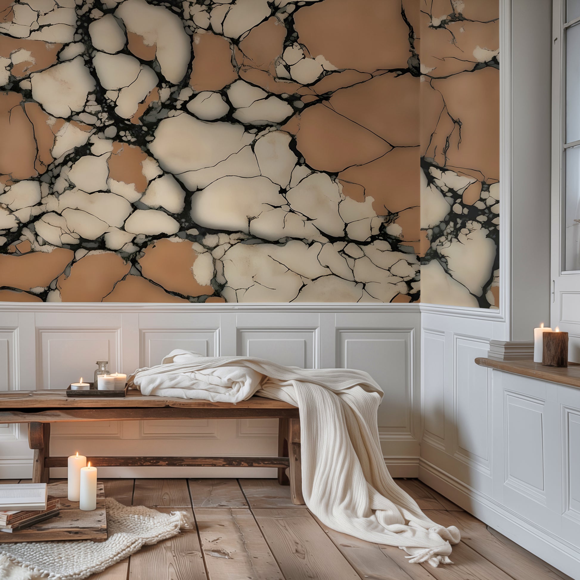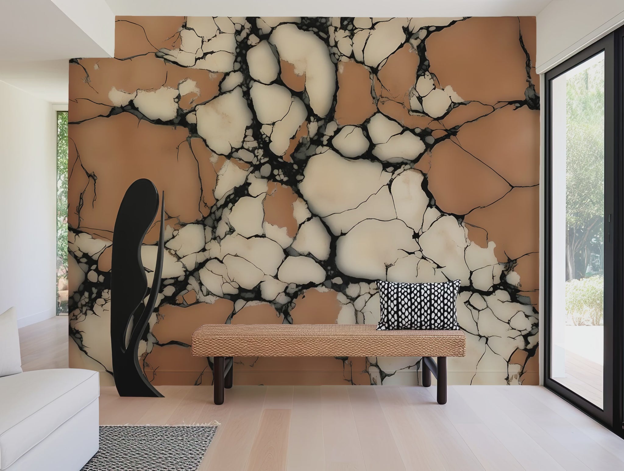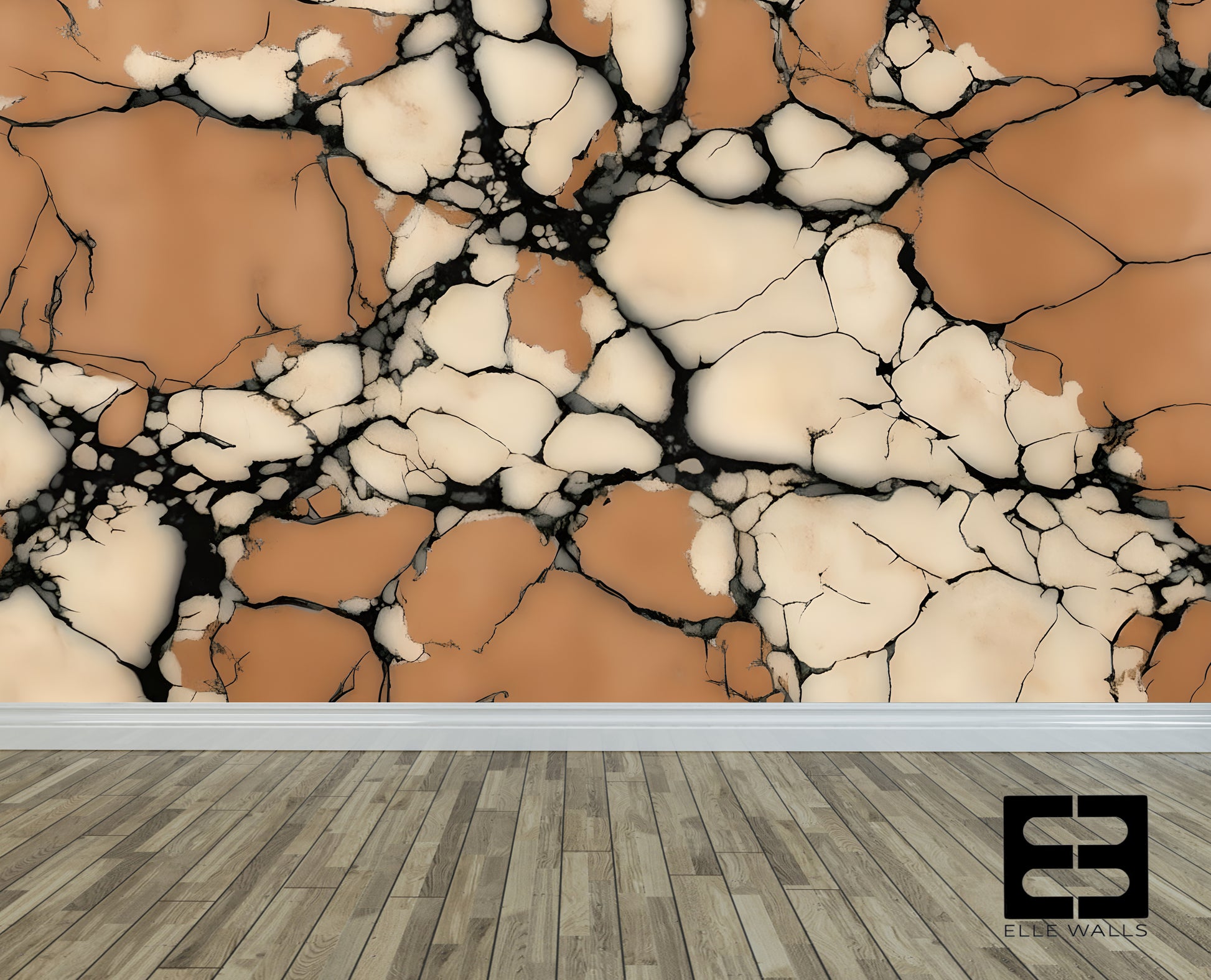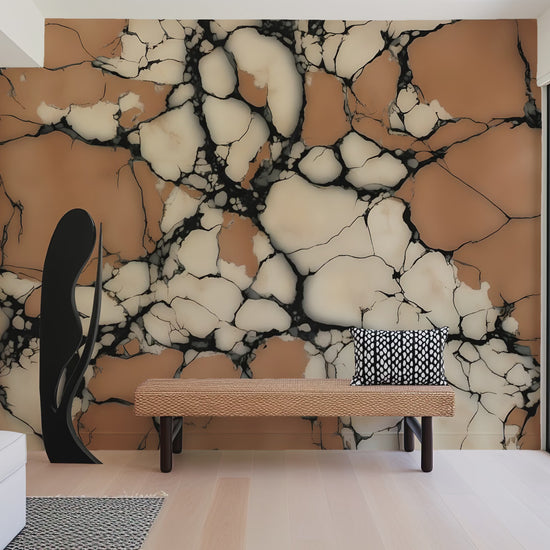 Elevate your space with this stunning Terracotta colored Marbled Wallpaper Mural, featuring Terracotta colors, beiges, and black. The striking design evokes a minimalist feeling blending contemporary art with natural tones to create a high-end, gallery-inspired backdrop for your living room, bedroom, or office. Luxury wallpaper.