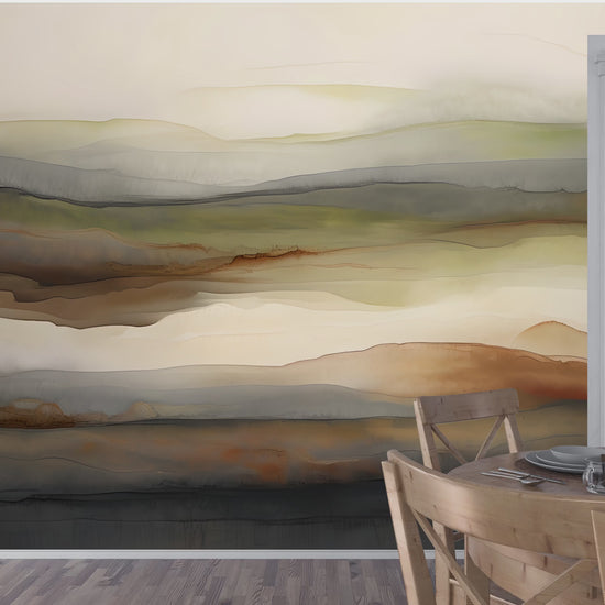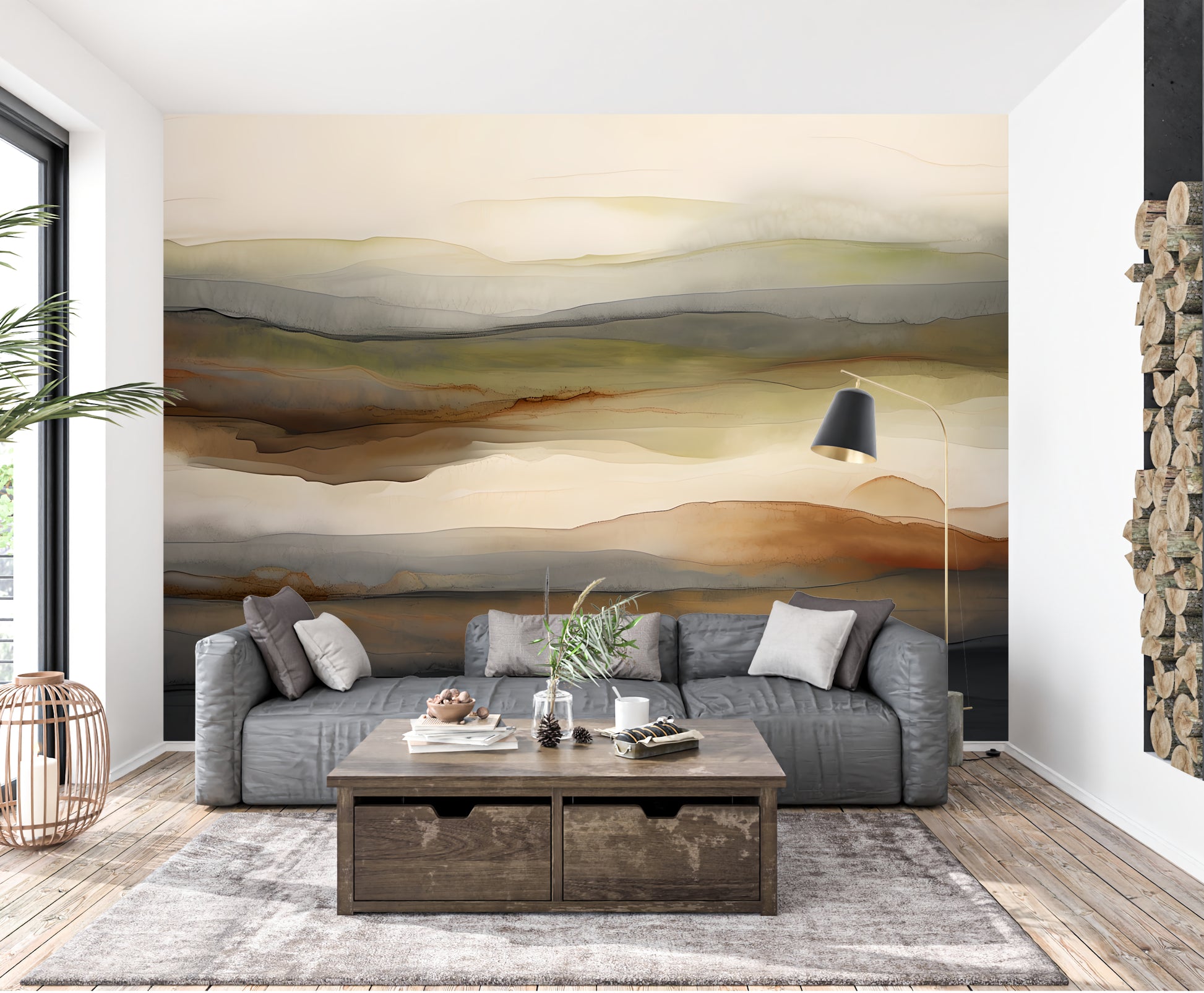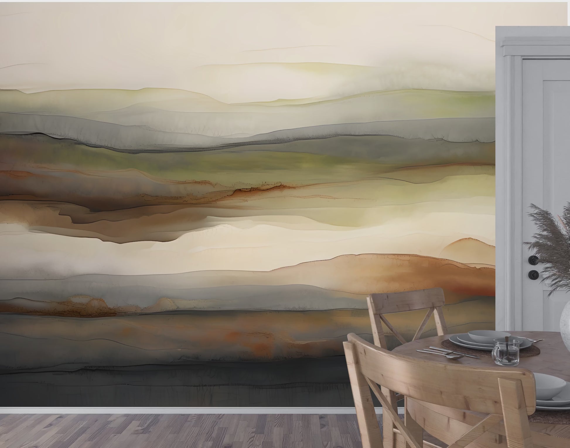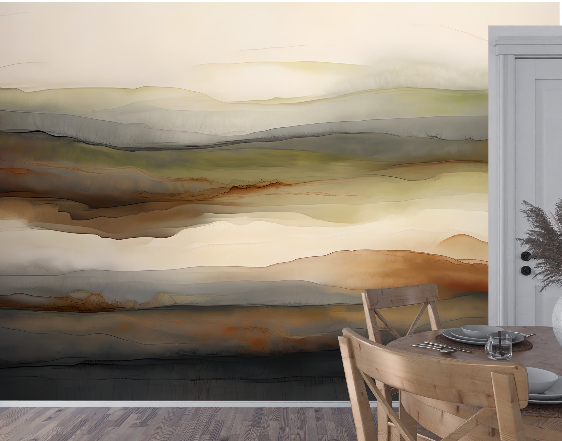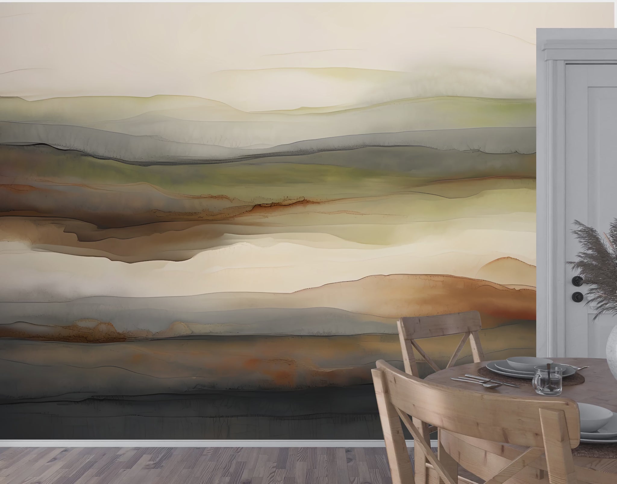 Elevate your space with this stunning Neutral Abstract Wallpaper Mural, featuring soft olive greens, beiges, ambers, rusts, greys, warm taupes, and black. The striking design evokes a minimalist feeling blending contemporary art with natural tones to create a high-end, gallery-inspired backdrop for your living room, bedroom, or office. Luxury wallpaper.