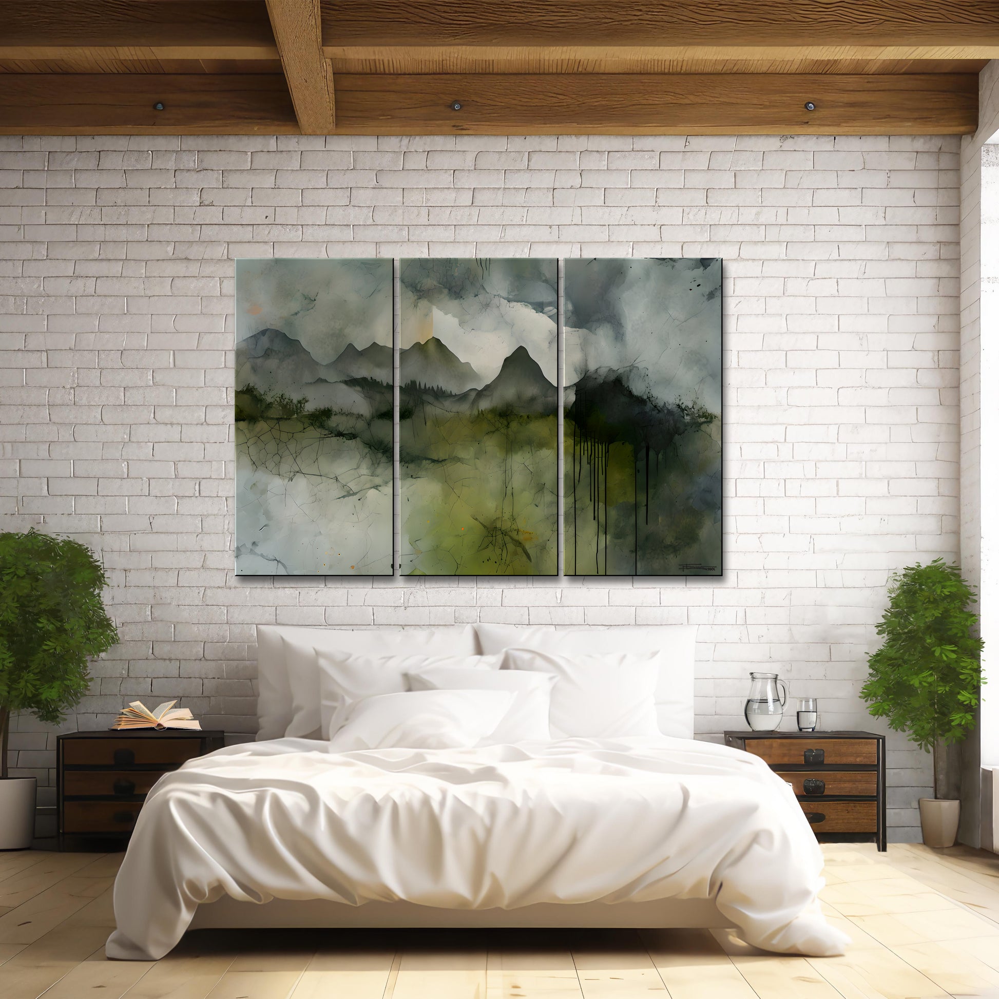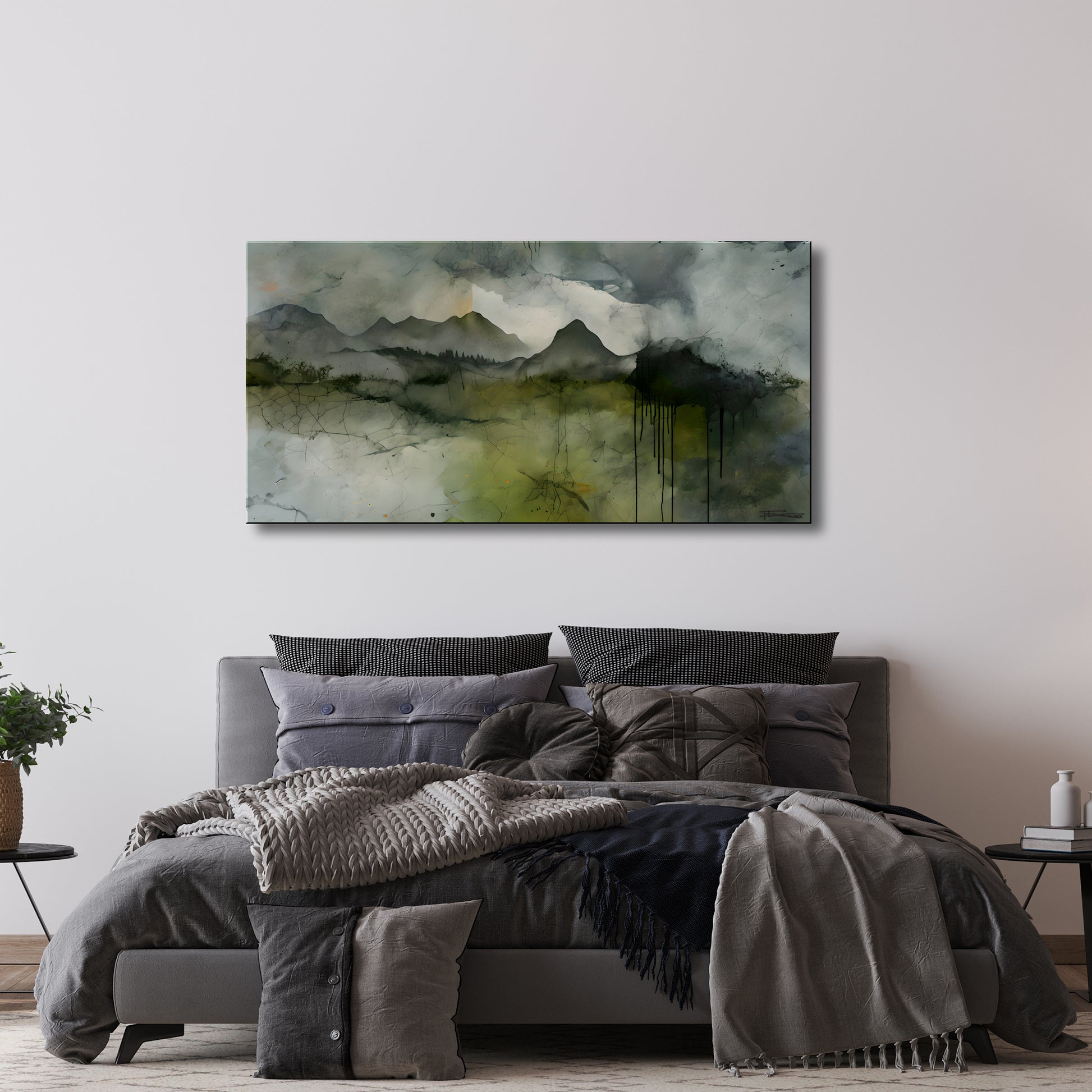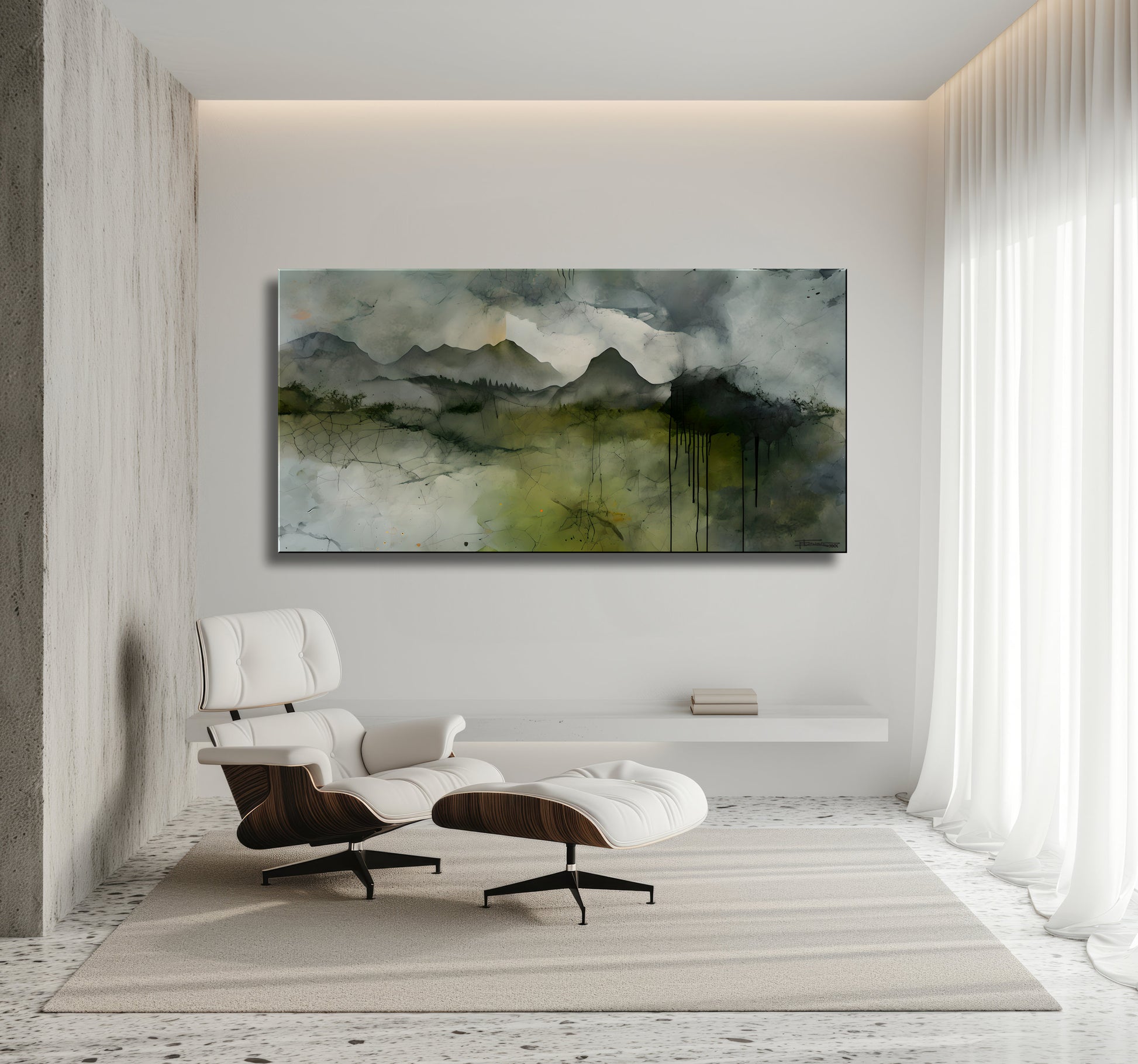 Bring sophistication to your space with this extra-large, hand-textured canvas painting featuring greens, grays, whites, and black tones. Distant abstract mountain range outlines evoke a sense of calm in this abstract landscapethat blends effortlessly into modern, minimalist, or rustic interiors.