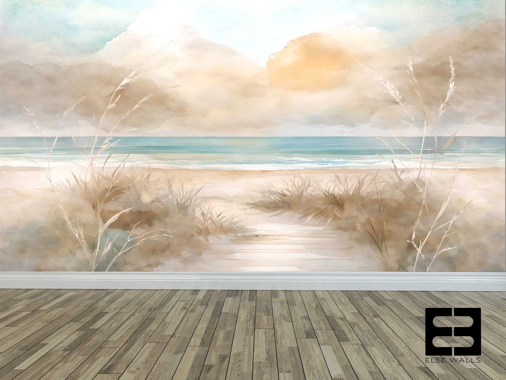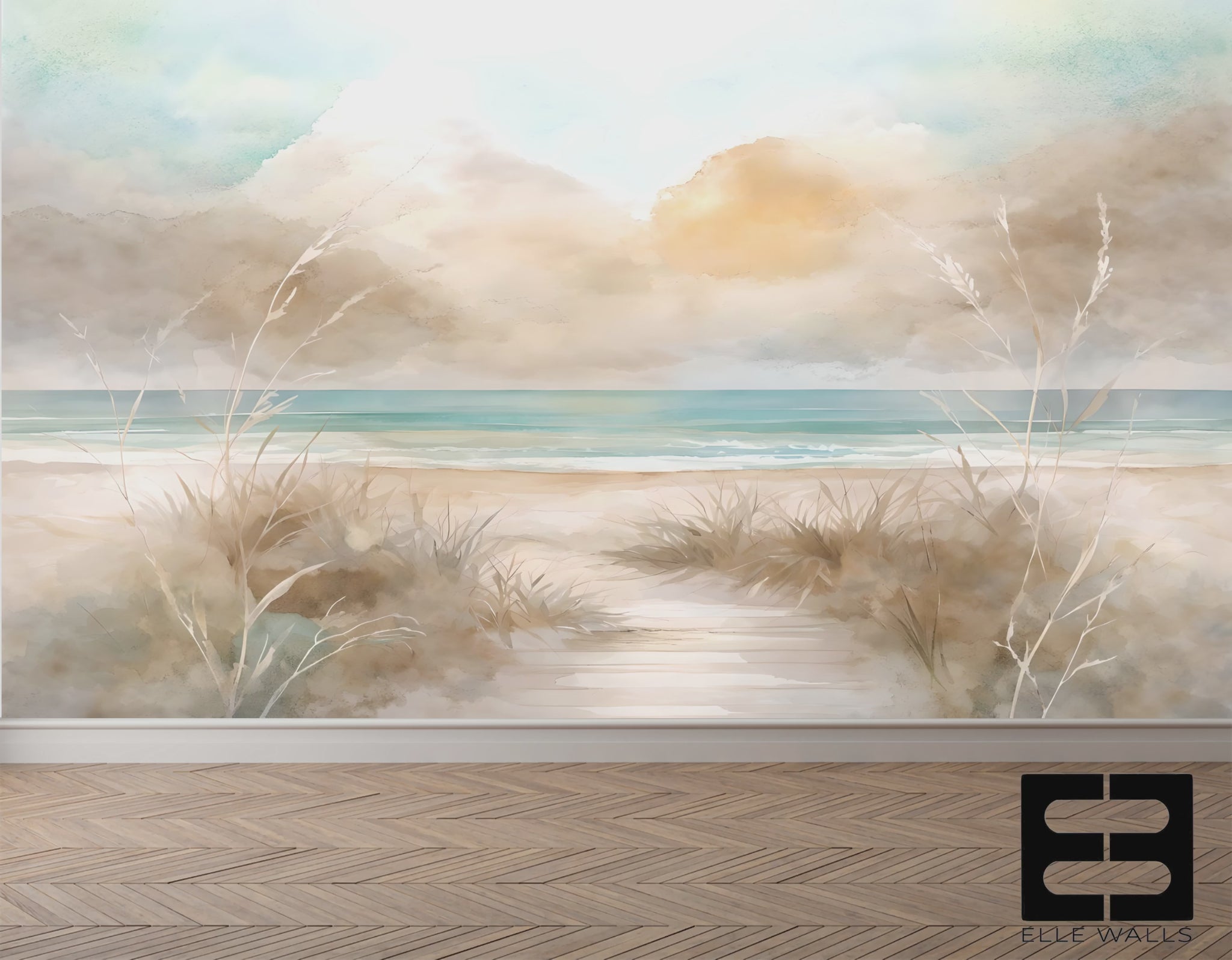 WATERCOLOR SEAGRASS LUXURY WALLPAPER MURAL - Elevate your space with this stunning painterly Wallpaper Mural, featuring soft muted aquas, beiges, tans blues and grays. The serenity of the coloring create a soothing, high-end, gallery-inspired backdrop for your living room, bedroom, or office. Luxury wallpaper. Also works great for all walls in high end powder bath! Stunning.