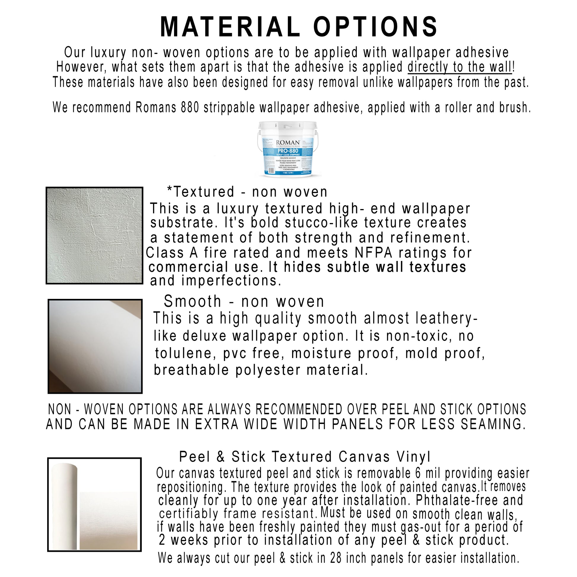 Non-Woven options come in 40 inch panels for a seamless effect. This type of paper is most recommended. It is easy to install with any brand of wallpaper adhesive applied directly to the wall, then simply glide the paper into position. Also easily strippable if applied with Roman 880 strippable wallpaper adhesive.